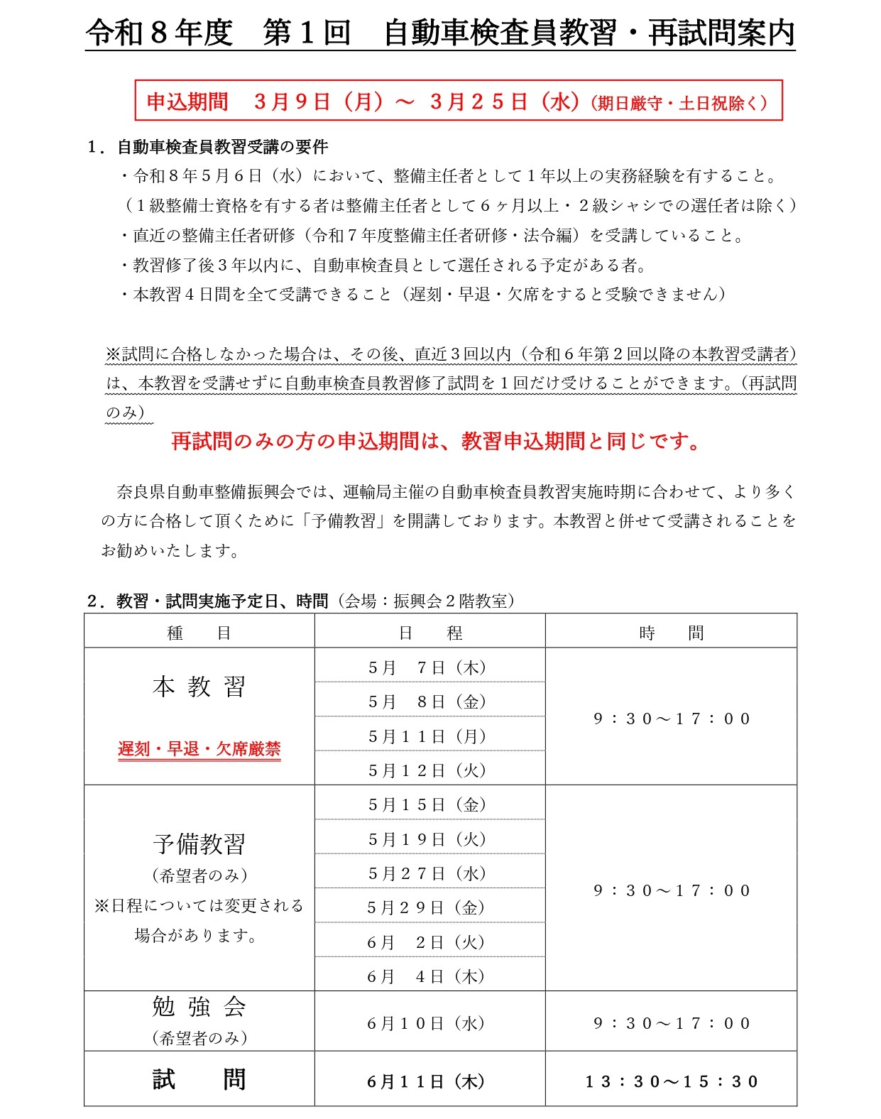 トップページ » 新着情報 » 令和8年度 第1回 自動車検査員教習・再試問案内【申込用紙もこちらから】