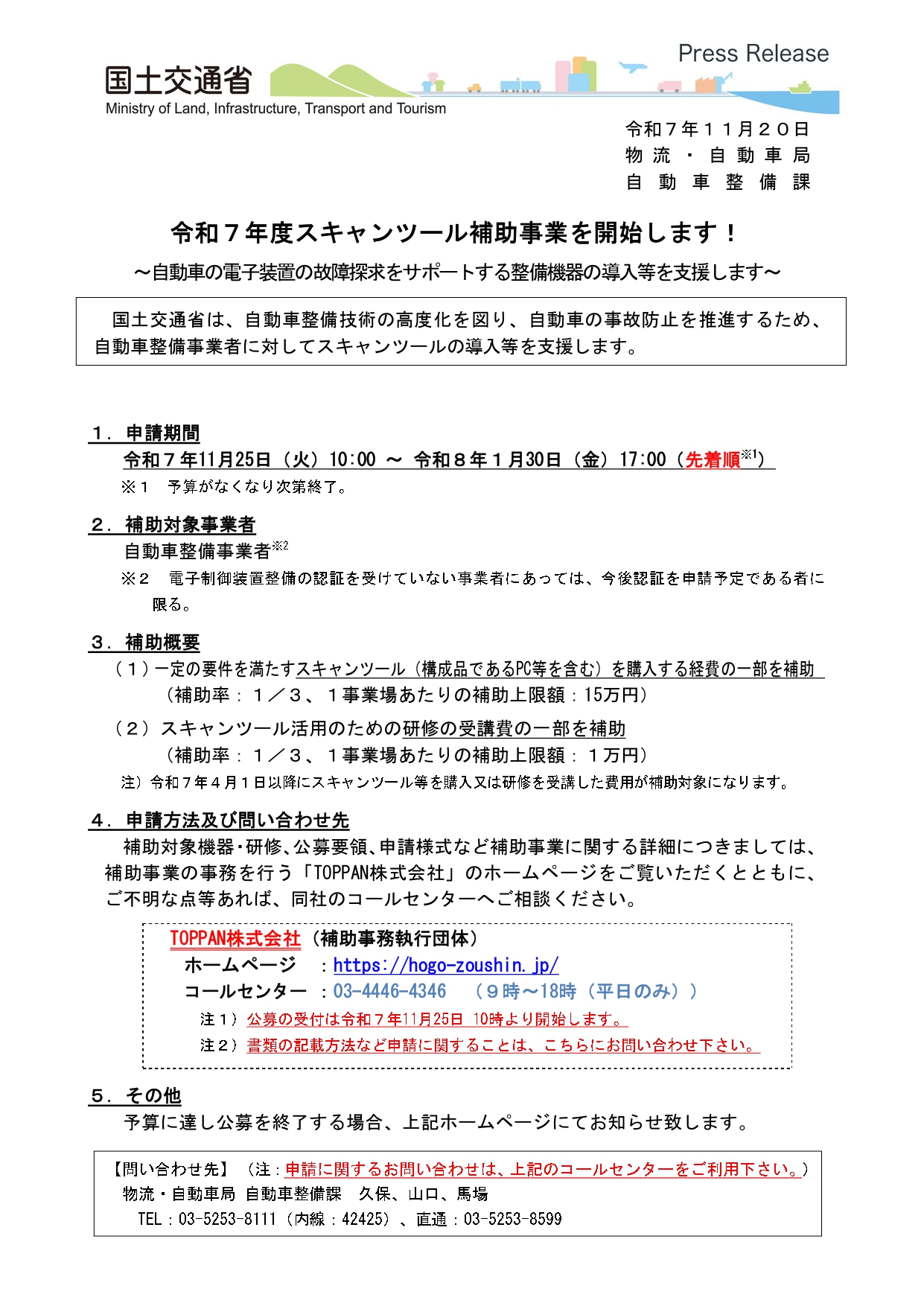 トップページ » 新着情報 » 令和7年度スキャンツール補助事業が開始されます