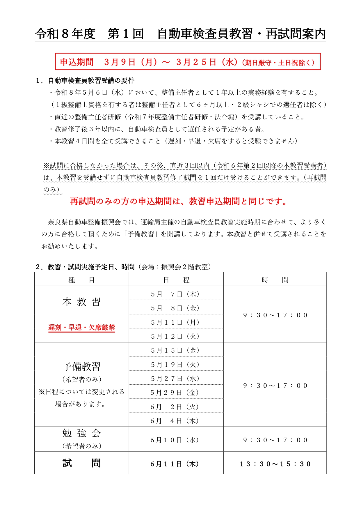 トップページ » 新着情報 » 令和8年度 第1回 自動車検査員教習・再試問案内【申込用紙もこちらから】